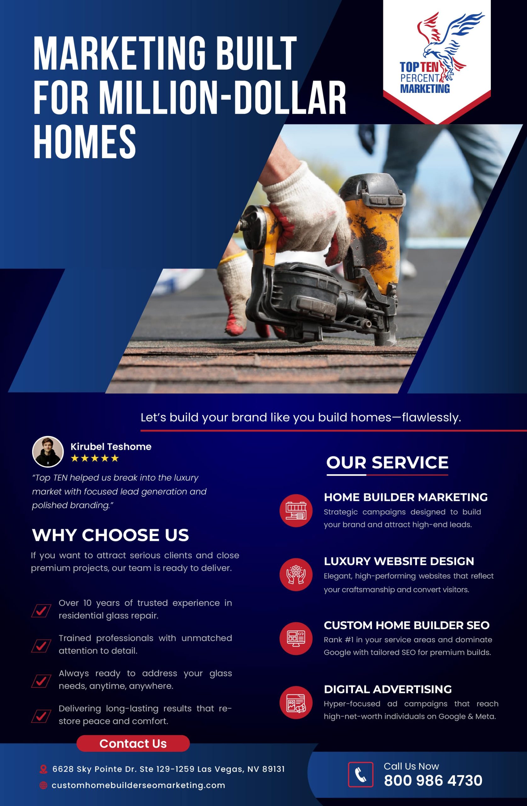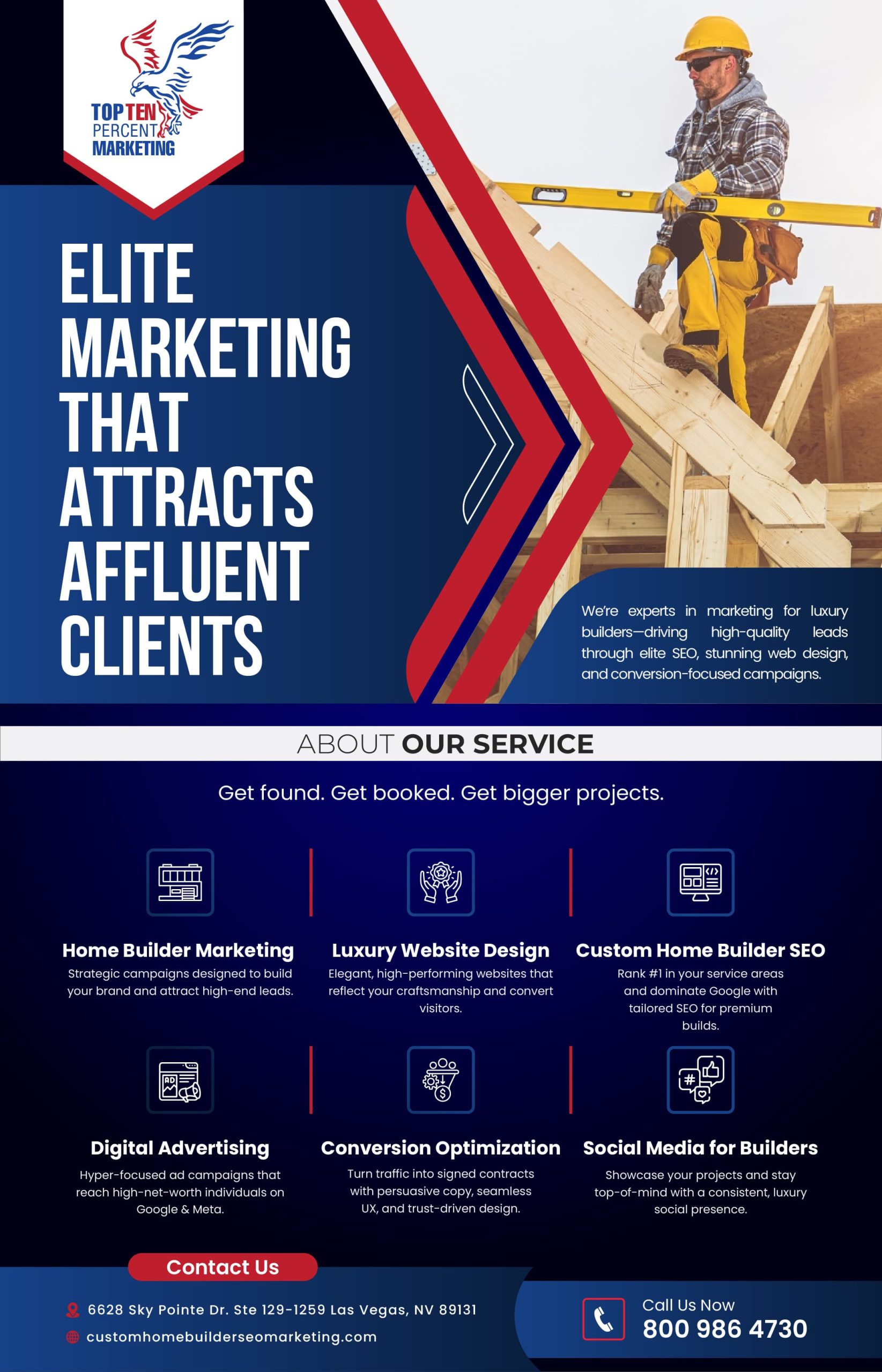 At Top TEN Percent Marketing, we provide a focused suite of digital services tailored exclusively for high-end home builders. Our strategies are not one-size-fits-all—they’re engineered to elevate your prestige, attract affluent clients, and drive measurable growth.